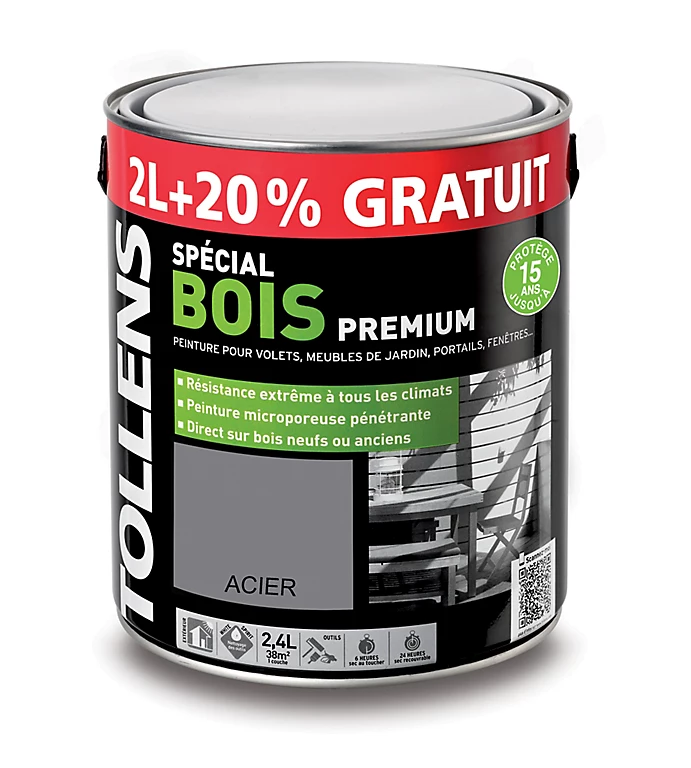 La peinture bois extérieur et intérieur acier 2 L + 20 % est une peinture laque glycérophtalique satinée, très résistante, conçue pour la décoration et la protection durable des boiseries extérieures: portes, volets, meubles de jardin, fenêtres, clôtures…