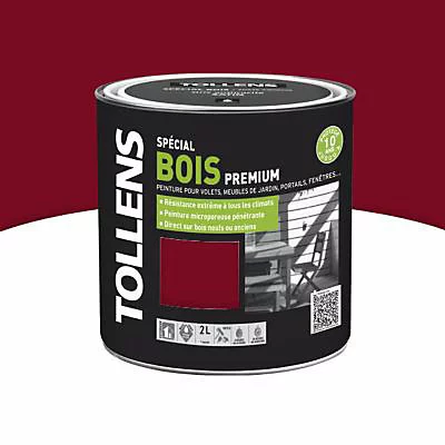La peinture bois extérieur Tollens rouge basque satin de 2L est une peinture laque glycérophtalique satinée, très résistante, conçue pour la décoration et la protection durable des boiseries extérieures: portes, volets, meubles de jardin, fenêtres, clôtures…